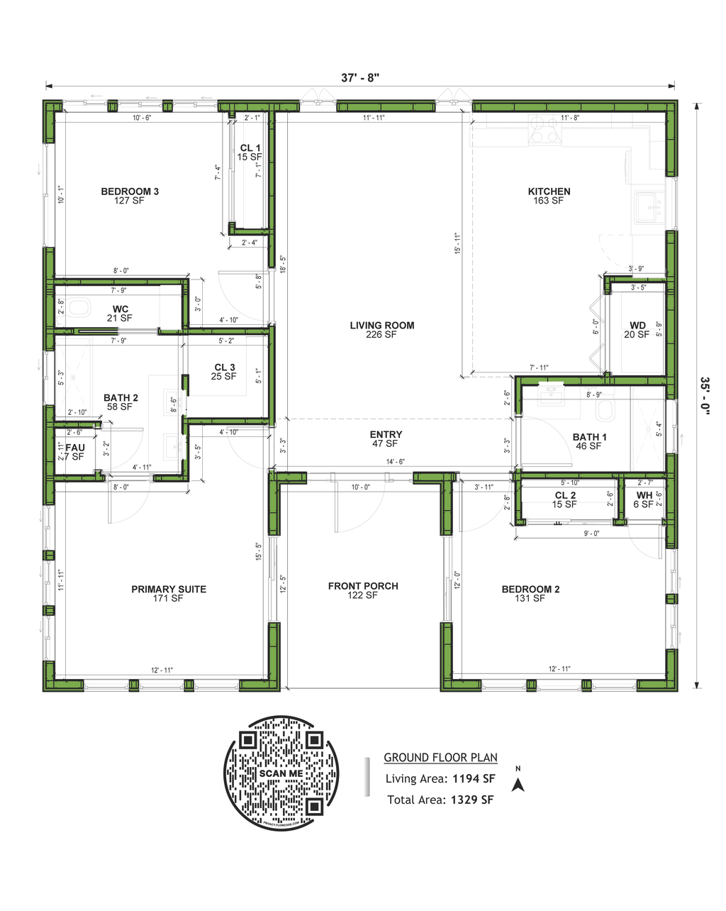 - Exterior Elevations: Views of the home from all four sides showing exterior materials and measurements.