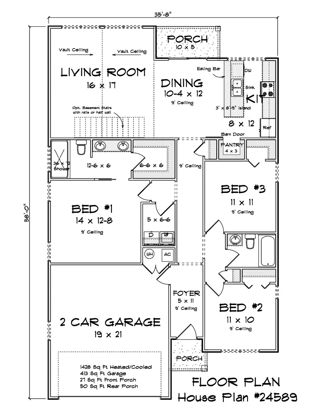 - Foundation Plan(s): This page shows all necessary notations and dimensions including footings, support columns, walls, and excavated/unexcavated areas.