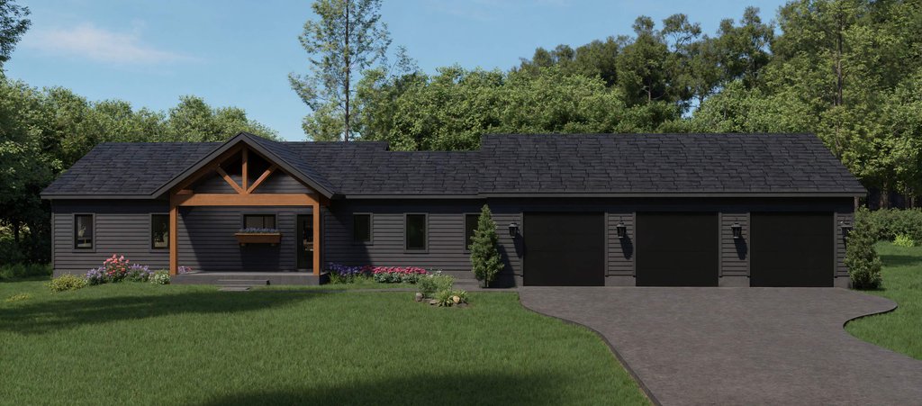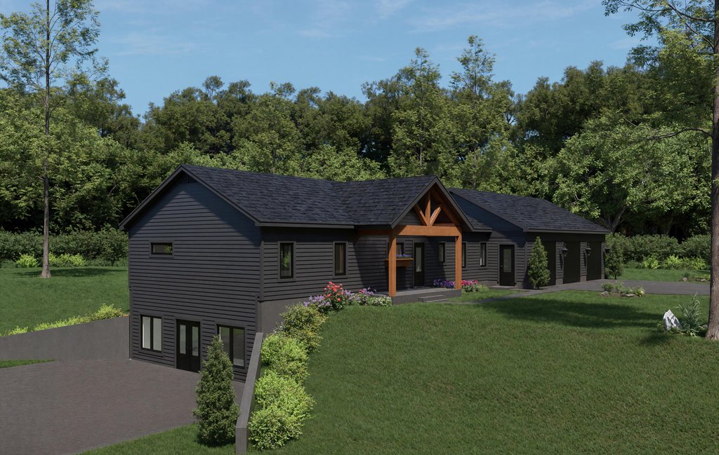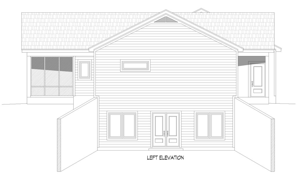 - Exterior Elevations: Views of the home from all four sides showing exterior materials, roof slope, ridge heights, siding and trim notes.