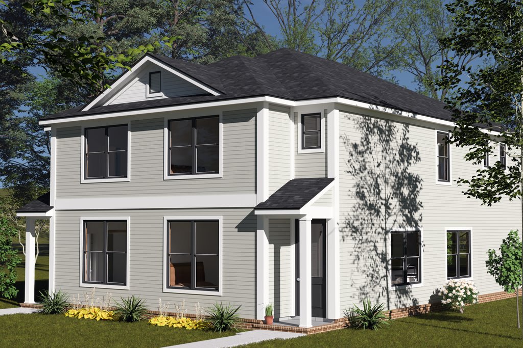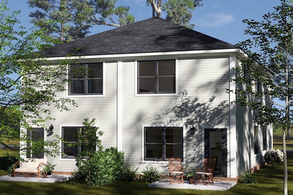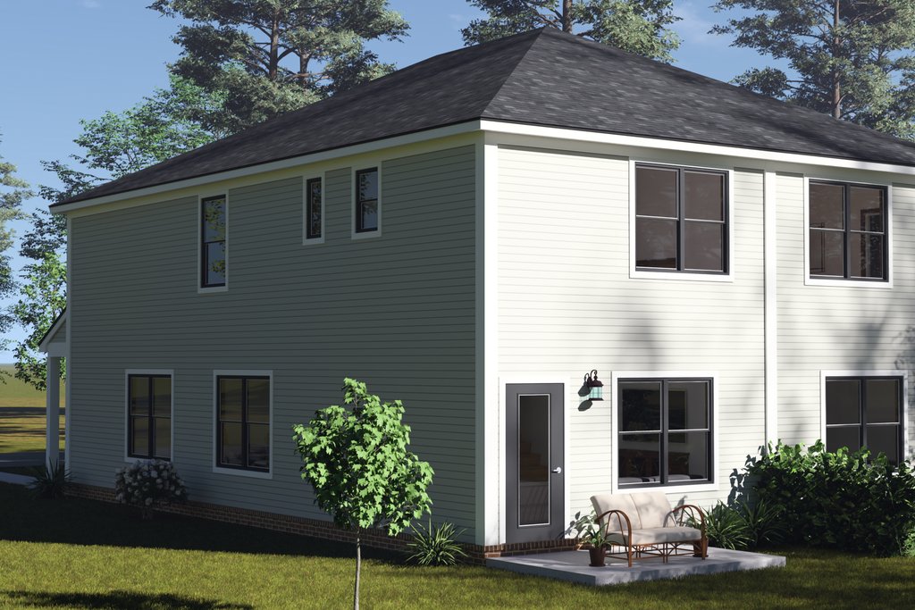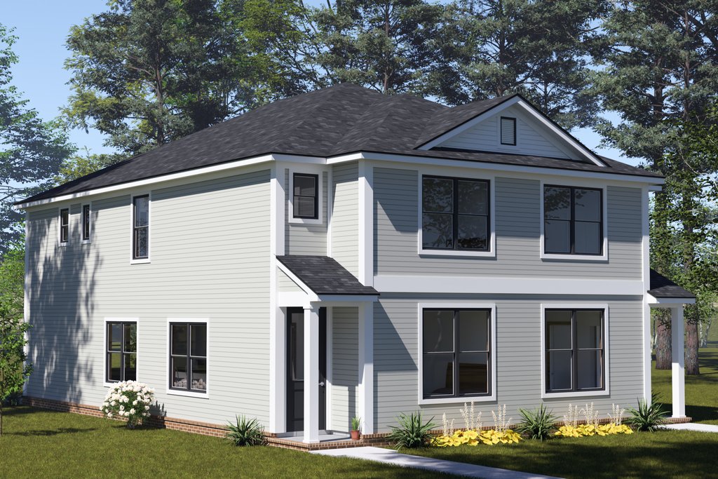 - Exterior Elevations: Views of the home from all four sides showing exterior materials, roof slope, ridge heights, siding and trim notes.
