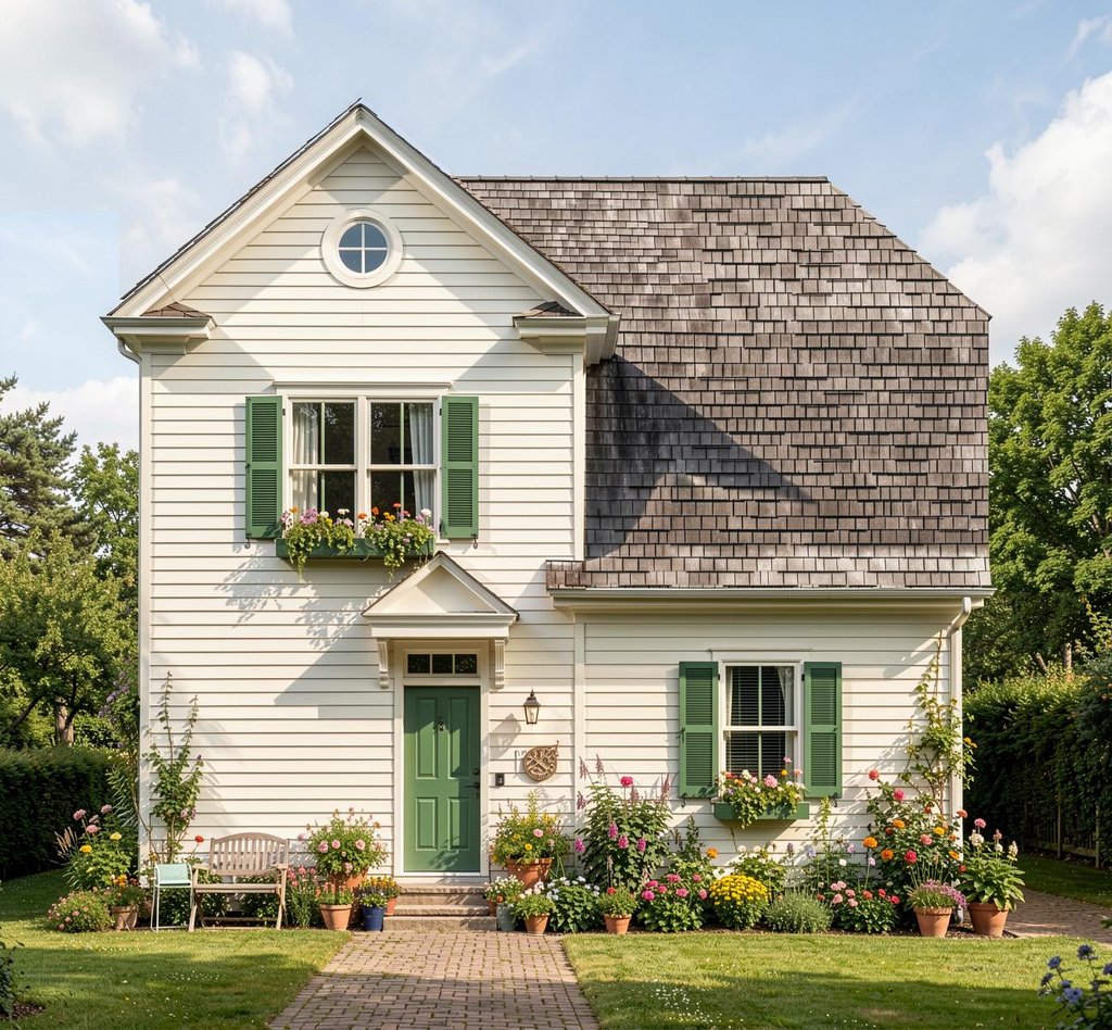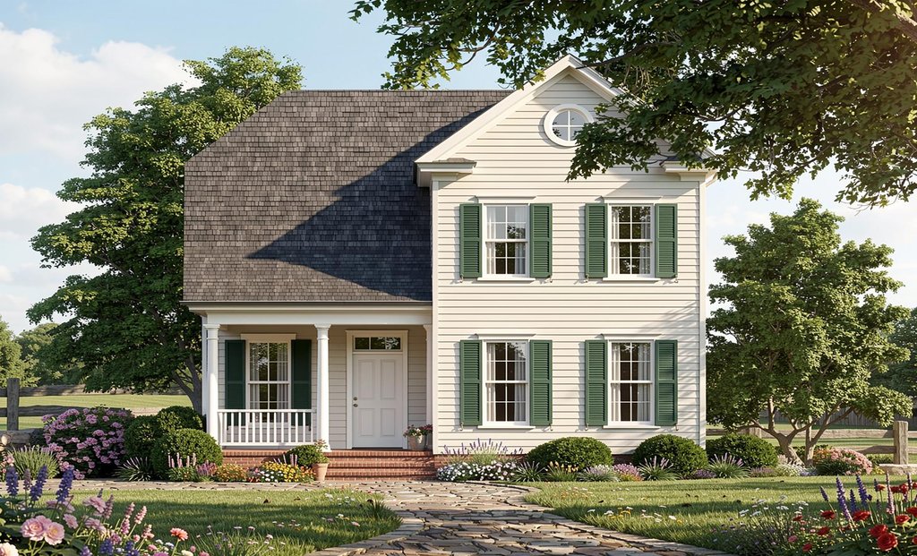 - Exterior Elevations: Views of the home from all four sides showing exterior materials, roof slope, ridge heights, siding and trim notes.