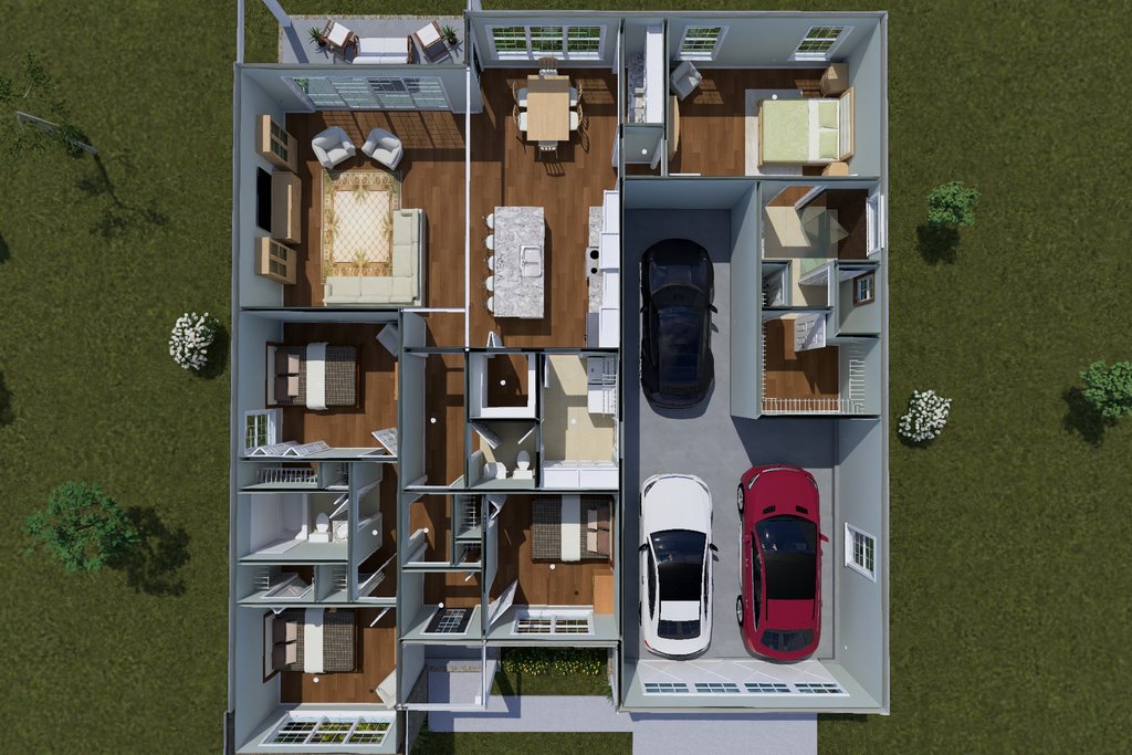 - Overhead Roof Plan(s): A view of the home from above showing roof pitch, peaks, valleys, and other details.