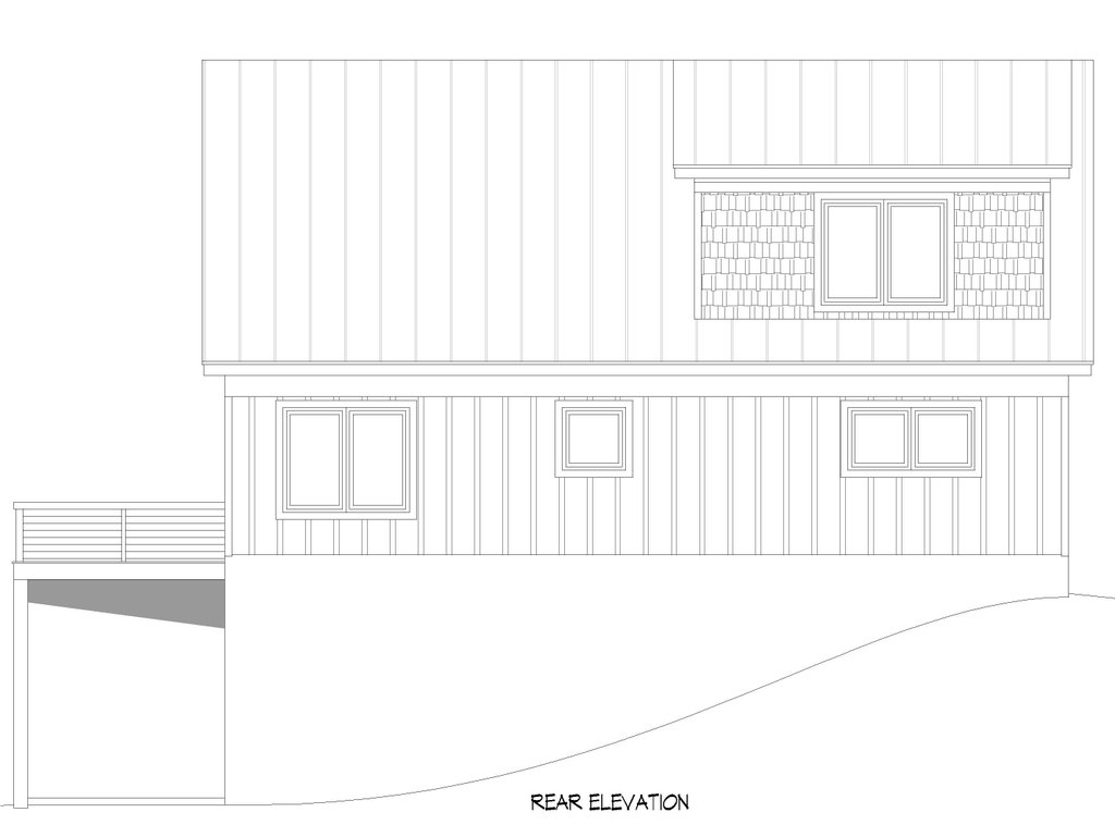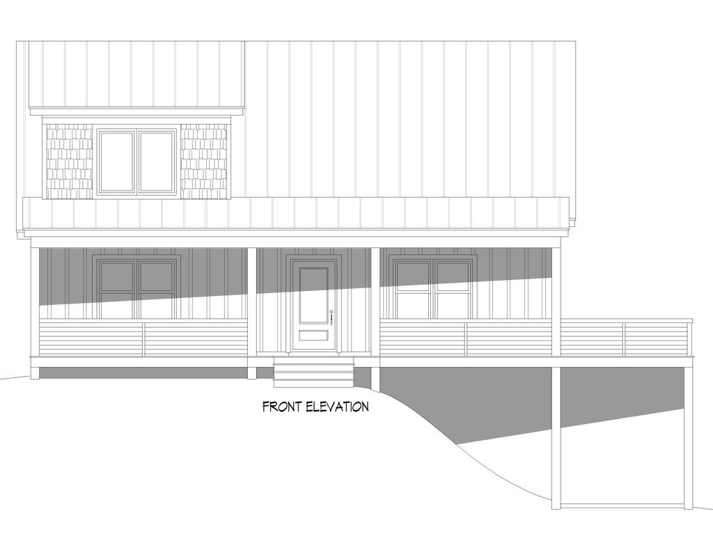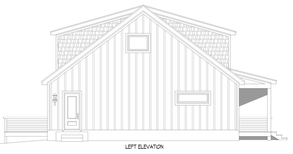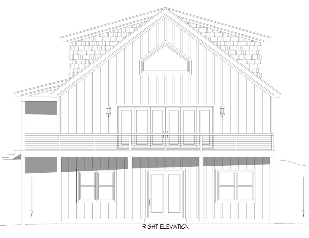 - Exterior Elevations: Views of the home from all four sides showing exterior materials, roof slope, ridge heights, siding and trim notes.
