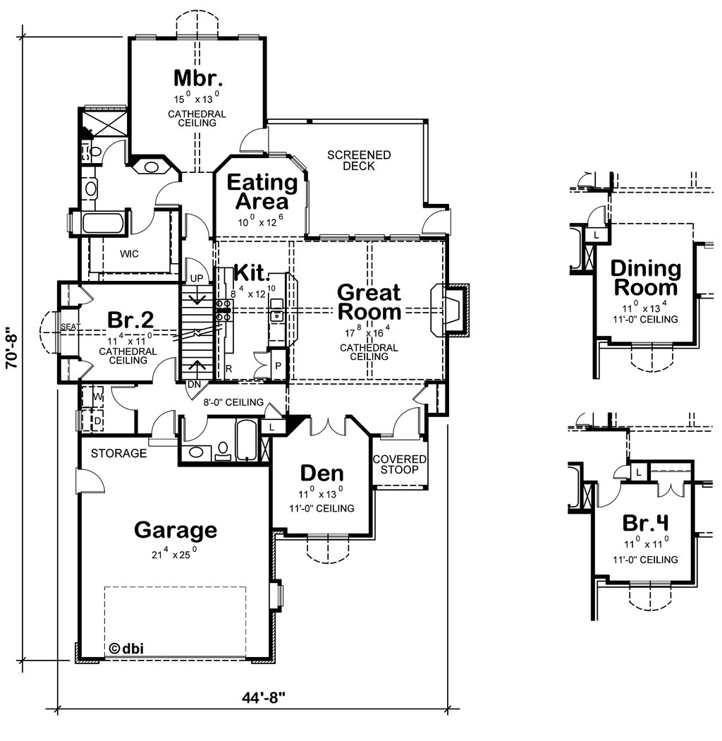 - Floor Plan(s): 1/4" scale. Fully dimensioned from stud to stud for ease of framing. The detailed drawings include such things as structural header locations, framing layout and kitchen layout.