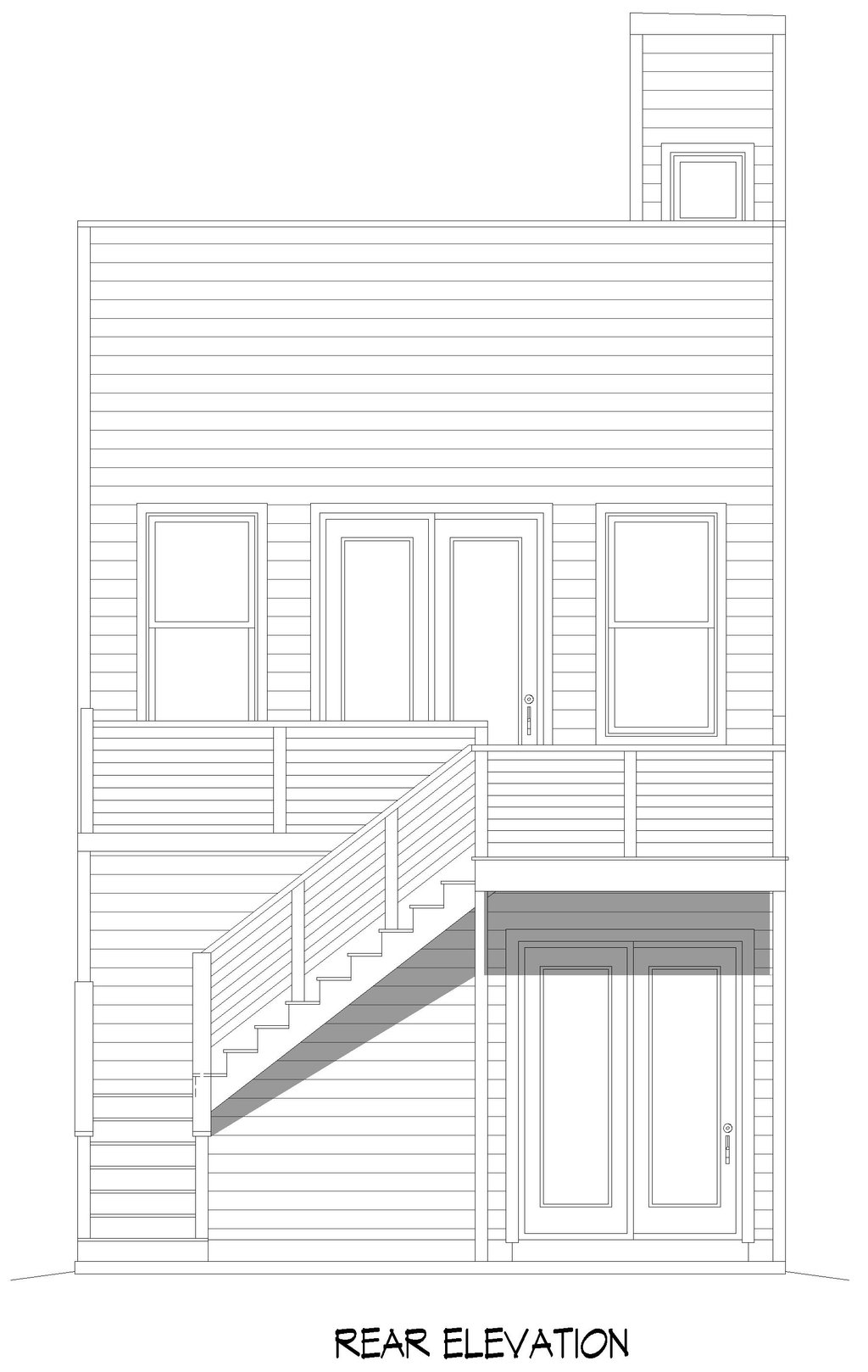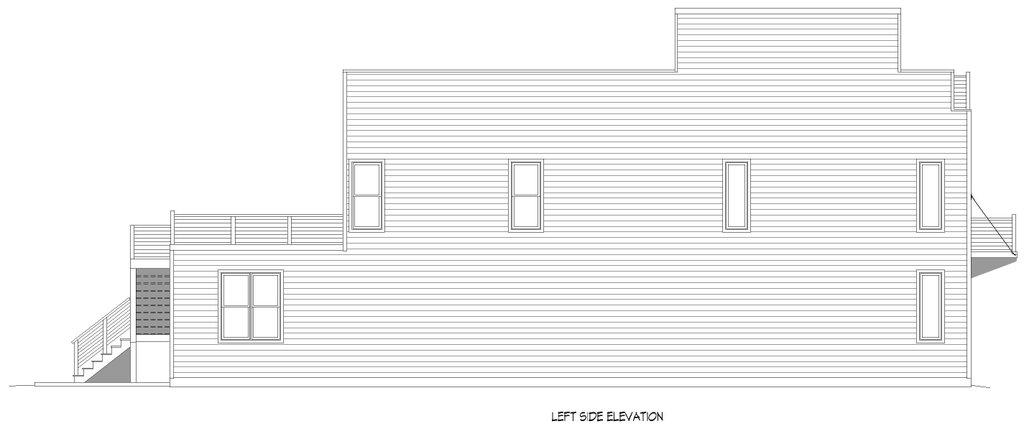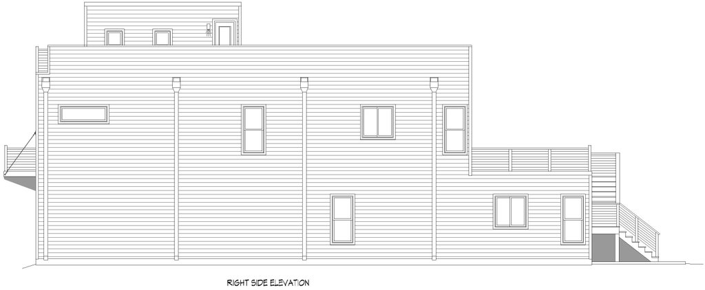 - Exterior Elevations: Views of the home from all four sides showing exterior materials, roof slope, ridge heights, siding and trim notes.