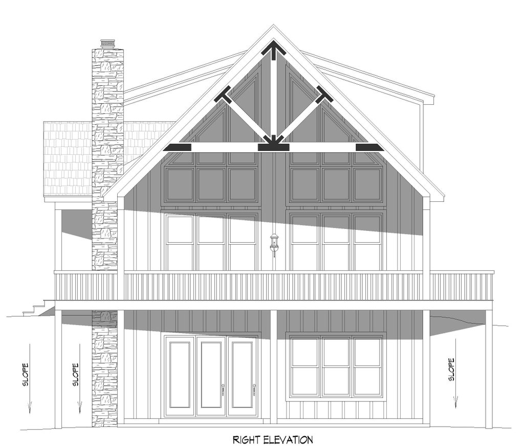 - Exterior Elevations: Views of the home from all four sides showing exterior materials, roof slope, ridge heights, siding and trim notes.