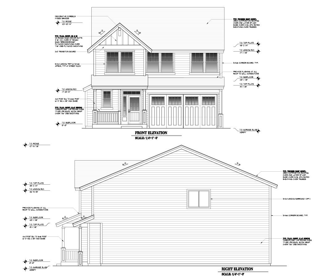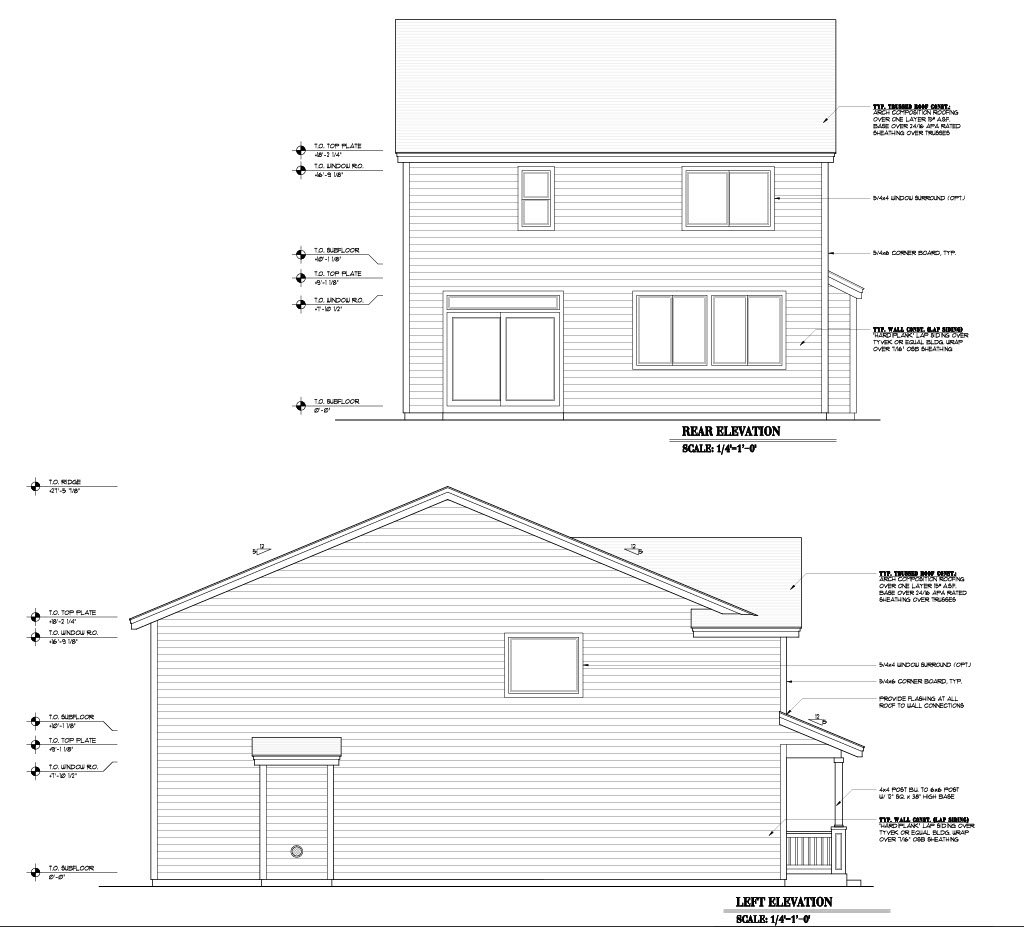 - Exterior Elevations: A blueprint picture of all four sides showing exterior materials and measurements.