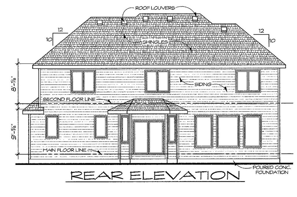 - Exterior Elevations: Drafted at 1/4" scale for the front and 1/8" scale for the rear and sides. All elevations are noted and an aerial view of the roof is provided, showing all hips, valleys and ridges.