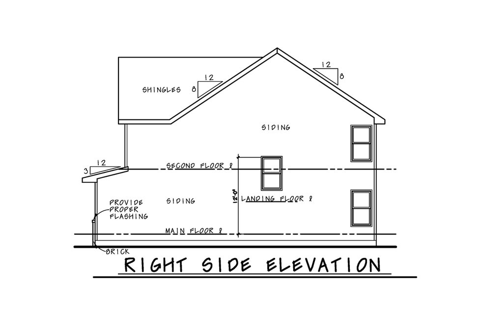 - Exterior Elevations: Drafted at 1/4" scale for the front and 1/8" scale for the rear and sides. All elevations are noted and an aerial view of the roof is provided, showing all hips, valleys and ridges.