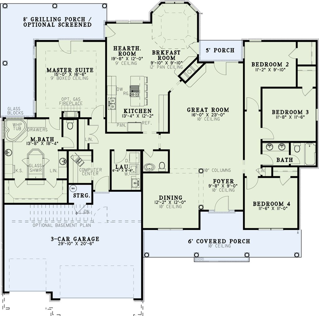 - Foundation Plan(s): Most plans are available with a slab or crawlspace foundation. Optional walkout style basement (three walls masonry with a wood framed rear wall with notes for the builder to locate the windows and doors) and optional full basement foundation available if the plan allows, at an additional cost. (Walk out is not shown on elevations unless finished walk out.)