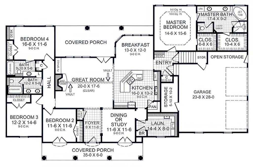 - Foundation Plan(s): Drawn to 1/4" scale, this page shows all necessary notations and dimensions including support columns, walls and excavated and unexcavated areas.