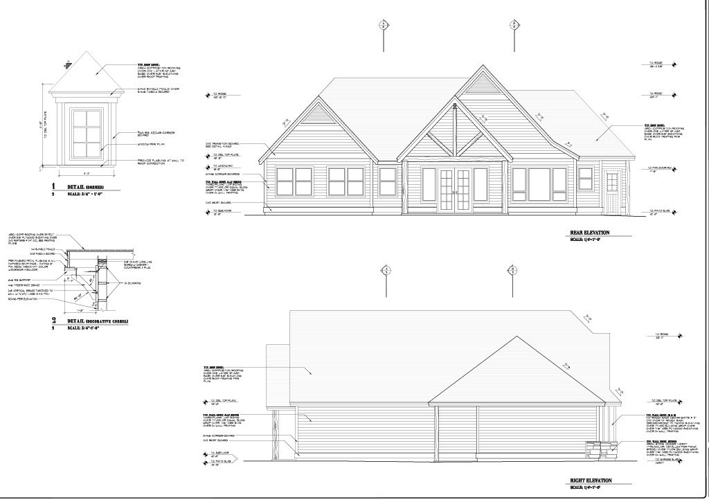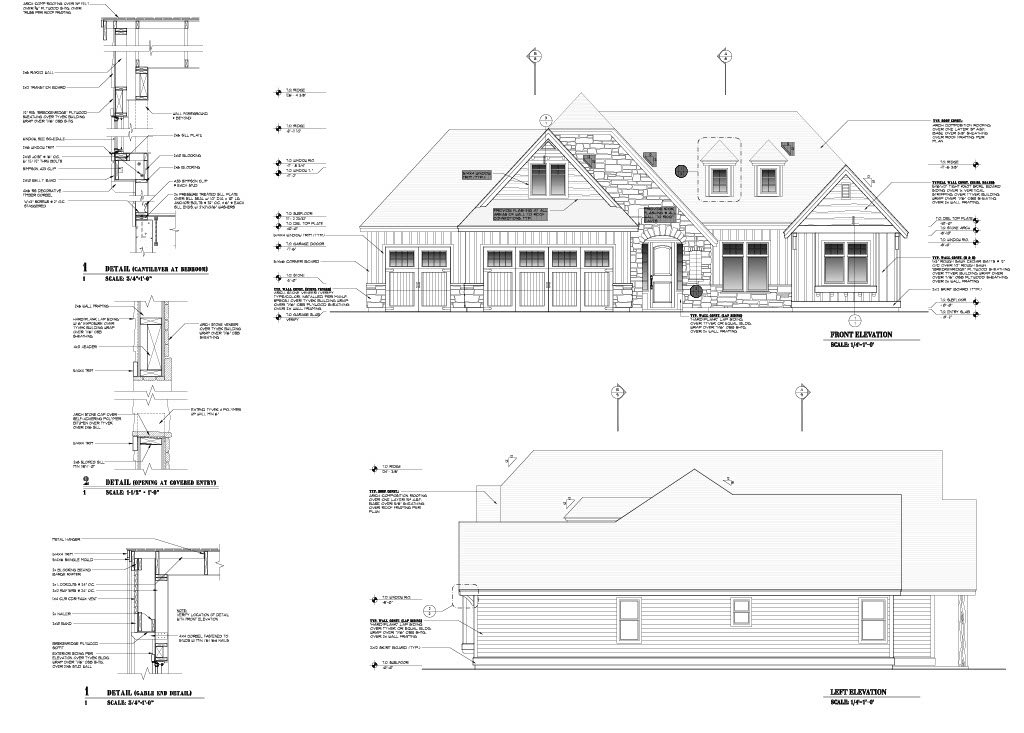 - Exterior Elevations: A blueprint picture of all four sides showing exterior materials and measurements.