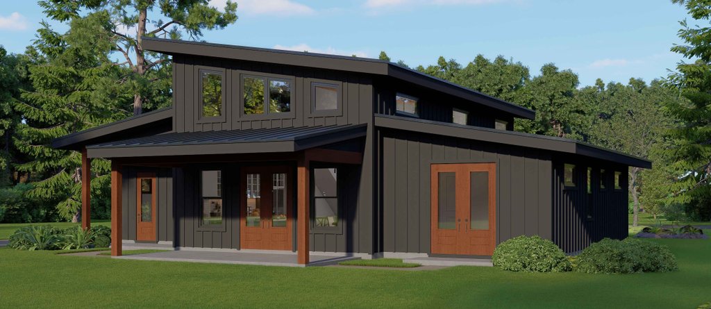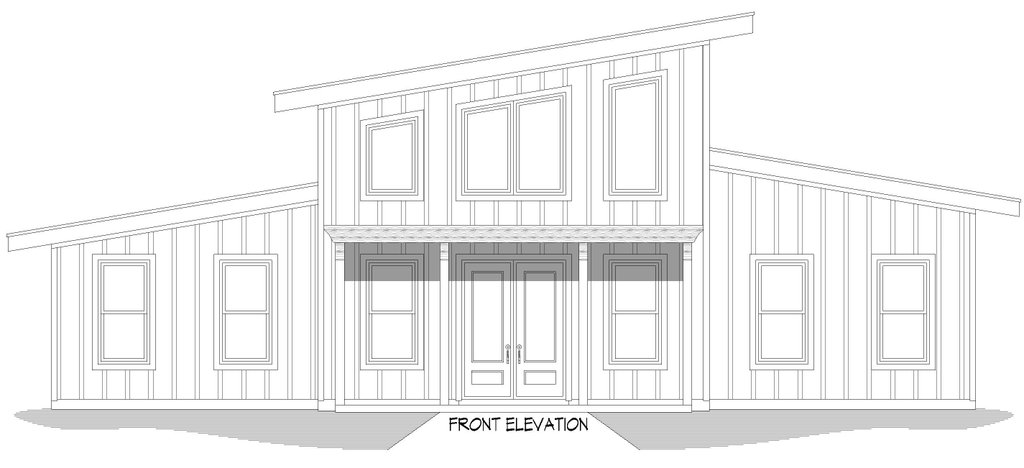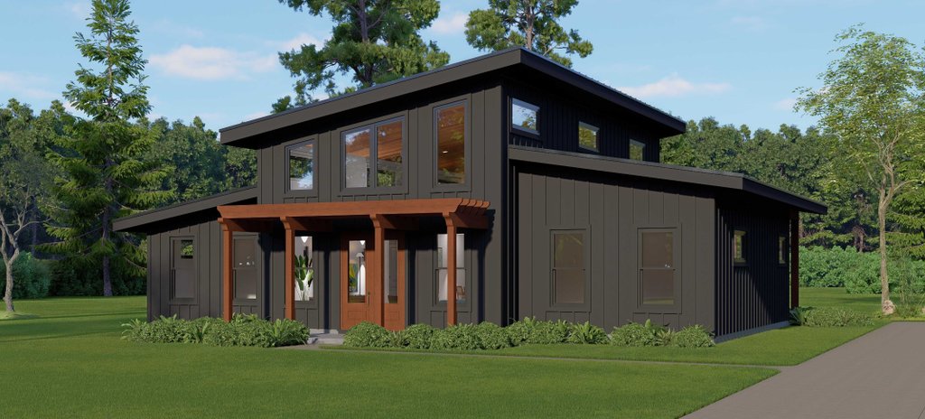 - Exterior Elevations: Views of the home from all four sides showing exterior materials, roof slope, ridge heights, siding and trim notes.