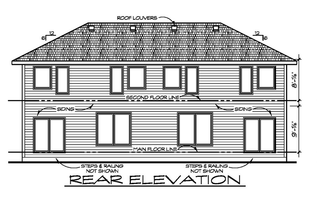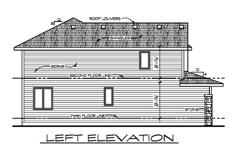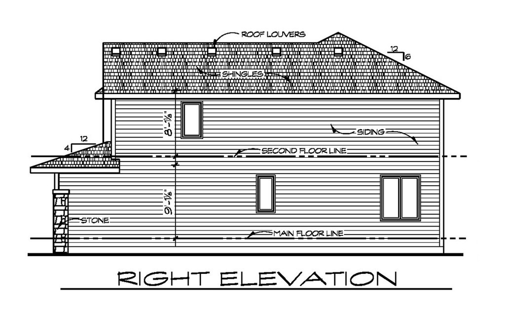 - Exterior Elevations: Drafted at 1/4" scale for the front and 1/8" scale for the rear and sides. All elevations are noted and an aerial view of the roof is provided, showing all hips, valleys and ridges.