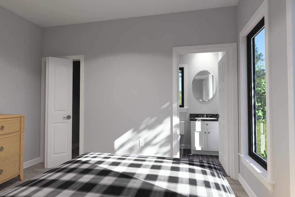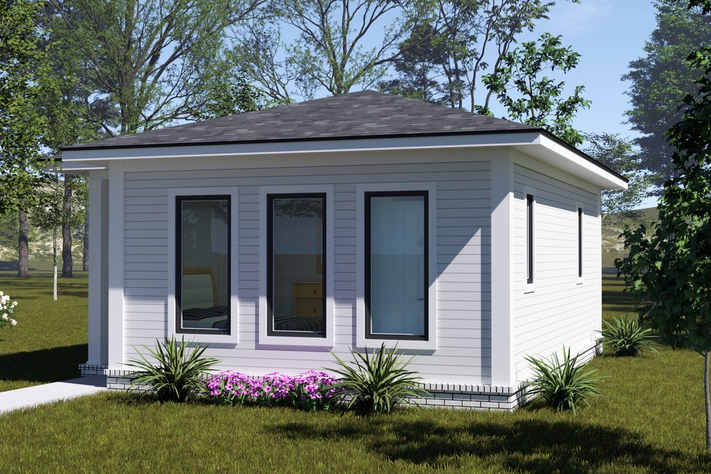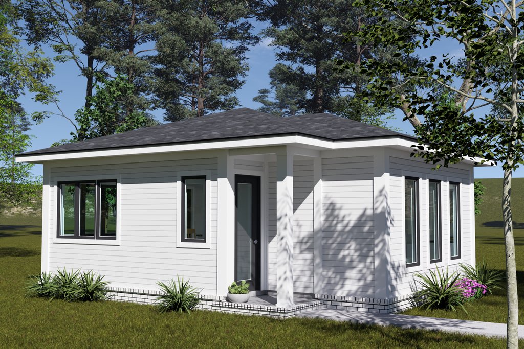 - Exterior Elevations: Views of the home from all four sides showing exterior materials, roof slope, ridge heights, siding and trim notes.