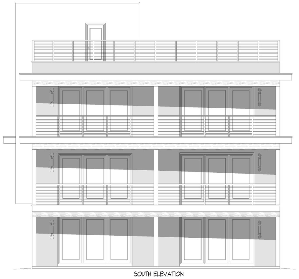 - Exterior Elevations: Views of the home from all four sides showing exterior materials, roof slope, ridge heights, siding and trim notes.