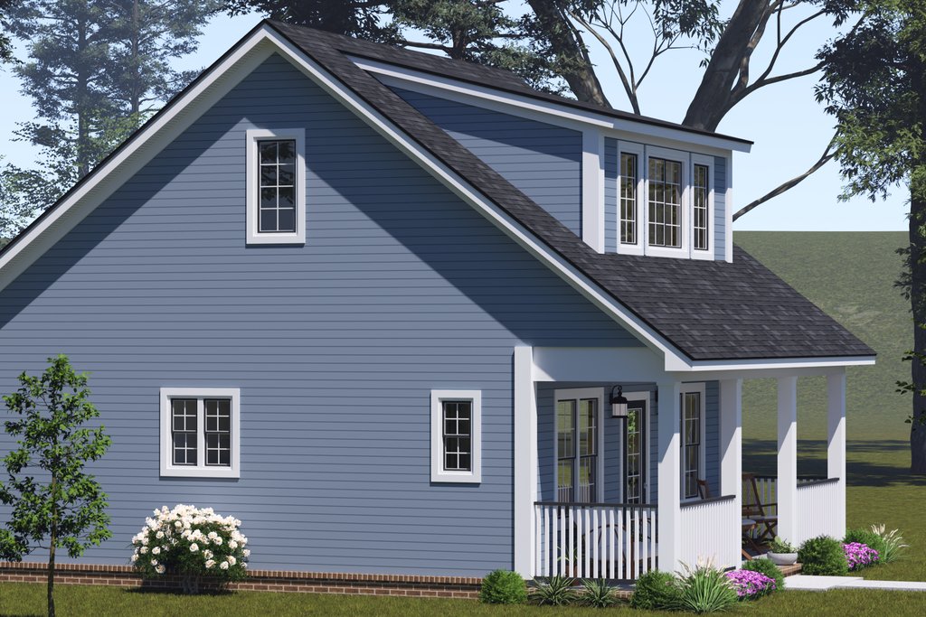 - Exterior Elevations: Views of the home from all four sides showing exterior materials, roof slope, ridge heights, siding and trim notes.