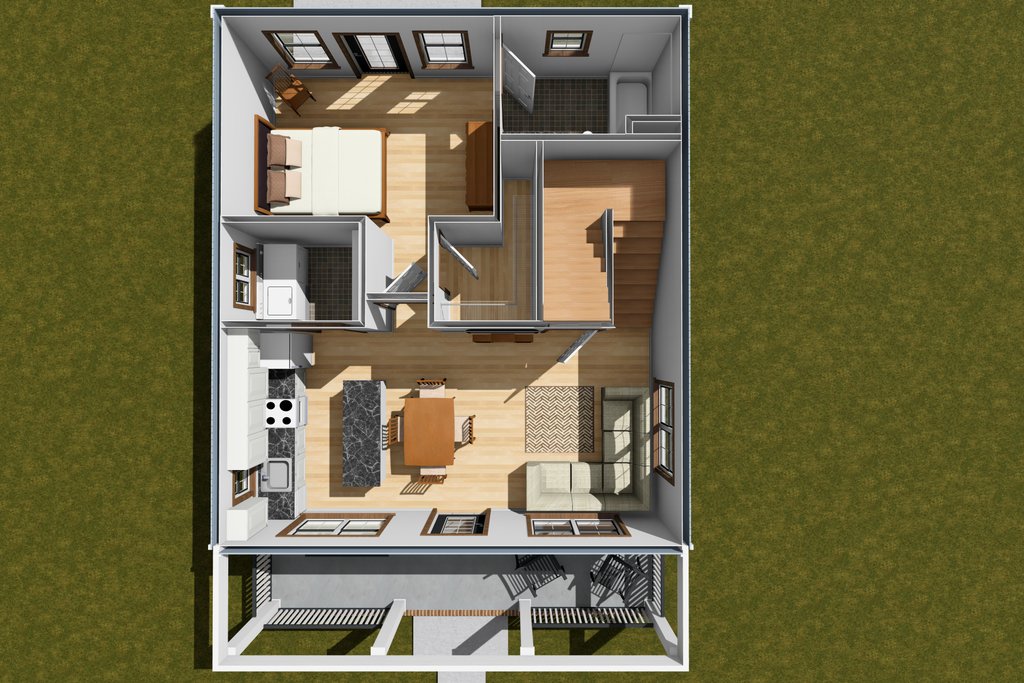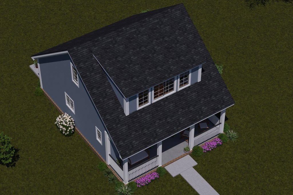 - Overhead Roof Plan(s): A view of the home from above showing roof pitch, peaks, valleys, and other details.